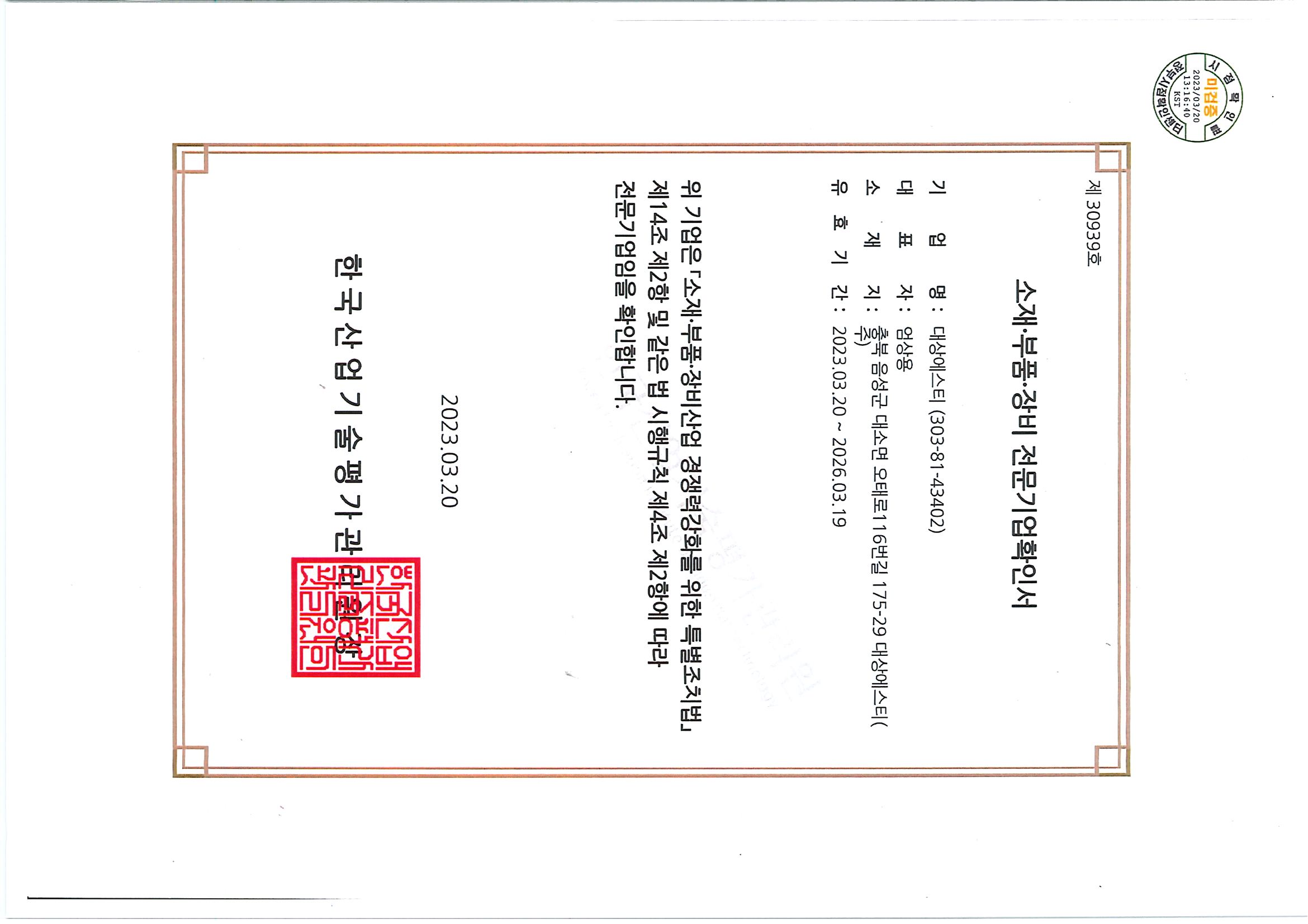 Certificate of company specializing in materials, parts, and equipment (2022)